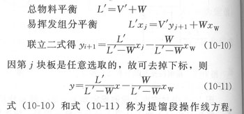 式(10—10)和式(10—11)稱為提餾段操作線方程。其意義表明在一定操作條件下,在提餾段內(nèi)任一了層板流到下一j+1層板的液相組成Xj與從下一層j+1板上到j(luò)層板上的氣相組成》Yi+1之間的關(guān)系。
