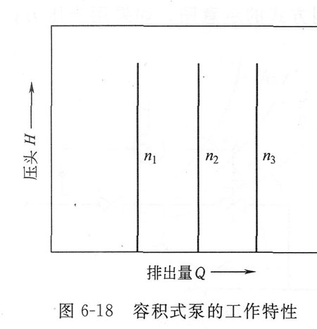 (2)容積式泵? 屬于這種類型的泵有活塞式、柱塞式等往復和橢圓齒輪式、螺桿式等旋轉泵。泵的運動部件與外殼之間的空隙很小(理論上應沒有空隙),流體不能在縫隙中流動。其排量的大小與管路系統無關。往復泵只取決于它的沖程大小和單位時間內的往復次數,旋轉泵則又取決于轉速。它們的工作特性大體相同,如圖6—18所示。由于這類泵的排量與管路系統的阻力無關,故非但不能采用在泵的出口處直接節流的方法來控制其排量,反而要注意,一旦出口閥關閉,將由于泵的壓頭太高,造成毀機的后果。因此,針對容積式泵的這些特點,a它們的控制方式有如下幾種。