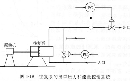 4)采用旁路調節來控制出口壓力,然后用直接節流閥控制其流量。顯然這兩個控制回路在動態上是關聯的。為此,在控制器參數整定時,應把它們的振蕩周期錯開。一般可以使壓力回路的操作頻率低一些,甚至整定成非周期的不振蕩過程,該控制系統如圖6—19所示。