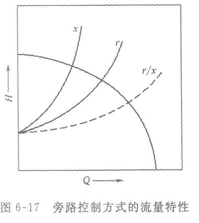 這種控制方式,其實質也是改變管路特性來達到控制流量的目的。此時,管路特性是原管路系統和旁路管系統特性的并聯結果。如圖6—17所示。圖中r為原管路系統的特性曲線,工為旁路管系統的特性曲線,將r和x的橫坐標相加所得的r/x曲線則為并聯管路系統的特性曲線。當旁路控制閥的開度改變時,x改變,并聯管路系統特性曲線也隨著變化,從而實際排出量得到了控制,顯然,采用這種控制方式,必然有一部分能量損耗在旁路管路和閥上。尤其對于大功率泵來說,在減小負荷時,泵所做的虛功增多。所以,總的機械效率較低,但它具有可用小口徑控制閥的優點。