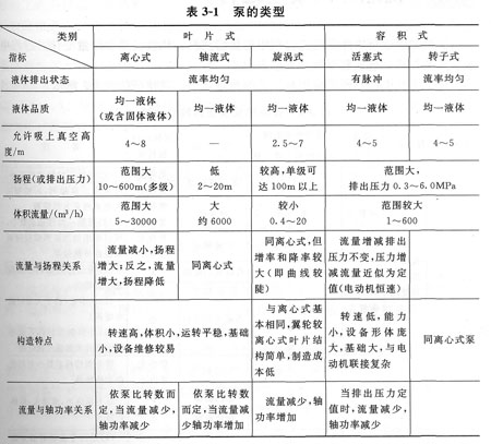 泵是化學工業等流程工業運行中的主要流體機械。泵的安全運行涉及流體的化工生產用泵的種類很多,并均有標準系列可查。表3—1為各種泵的特點簡,列出基礎數據,包括:介質物性(介質名稱、輸送條件下的密度、黏度、蒸氣壓、腐蝕性及毒性);介質中含有的固體顆粒種類、顆粒直徑和含量;介質中氣體含量(體積分數);操作條件(溫度、壓力、流量);泵所在位置的情況(包括環境溫度、海拔高度、裝置平立面布置要求等)。
