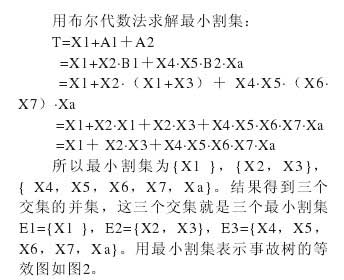 最小割集在事故樹分析法中占有重要的地位,它是引起頂上事件發生必須的最低限度的割集,即最小割集中任一基本事件不發生,頂事件一定不會發生,最小割集的求取方法有行列式法、布爾代數法等,在實際分析中常采用布爾代數法。以下簡要介紹布爾代數化簡法。