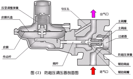 ??? 參見圖(2),與普通調壓器不同之處在于,它內部有兩個裝在同一閥桿上的閥瓣,并有兩個同心的閥座,右面的一個閥瓣,是工作閥瓣或主閥瓣,用于調節輸出壓力;它的左面,是防超壓閥瓣或輔助閥瓣,專門用作超壓切斷;結構上不難看出:氣路中兩個閥瓣所構成的兩個閥門之間呈串聯關系,只要有一道閥關閉,就會切斷氣路;在氣路走向上,先流過主閥瓣,再流過輔助閥瓣;兩個閥的關閉動作不同步,順序是主閥瓣在先,輔助閥瓣在后。
