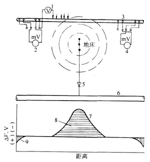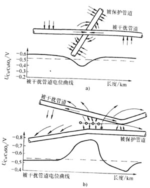 隨著陰極保護技術的推廣應用,也會給地下帶來大量的雜散電流。如近些年來城市地下燃氣管道 給水管道、地下電纜等采用了外加電流保護,在它的陽極地床附近可能會造成陽極地電場干擾。在被保護的管道(或電纜)附近可能會造成陰極電場的干擾。其干擾形式如圖10-62和圖10-63所示。其干擾范圍與陽極排放電流和陰極保護電流密度成正比。當單組犧牲陽極輸出電流大于100mA時,也應注意其干擾。
