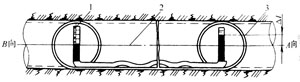 垂直方向偏差的測量可用水平儀,只測量最前一節管子的管底標高,或采用水柱連通器測定。如圖9-8所示。水柱連通器是利用在同一容器中液體壓力平衡原理制成。該方法是在頂進管道內壁確定1條與管線相平行的直線為基準線,將水柱連通器液面線與該基準線的頂端和末端重合。如頂進管道發生垂直方向偏移,連通器兩端玻璃管內的水平面,將會高出或低于基準線。