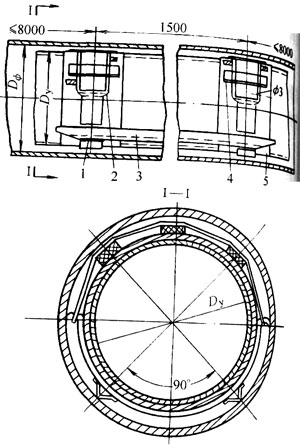 h.套管內的燃氣管道安裝。安裝在套管內的燃氣管道要采用特殊加強防腐蝕層。為了防止燃氣管道進入套管時損壞防腐層,燃氣管道安裝滾動支座或滑動支座。如圖9-10,滑動支座事先固定在燃氣管道,支座與燃氣管道之間墊橡膠板或油毛氈,防止移動燃氣管道時支座擦傷防腐層。支座間距按設計要求。支座的形式很多,但一定要保證支座與燃氣管道使用壽命相同,避免由于銹蝕等原因使支座損壞而使燃氣管道懸空、承受過大的彎曲應力。