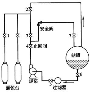 利用壓縮機升壓輸送氣體的性能,提高液化石油氣儲罐內壓力,使液態液化石油氣流入空瓶內。