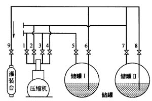這種流程,必須具備氣相和液相兩根管道和兩個以上的儲罐才可采用。在灌瓶前需用壓縮機加壓一定時間,在壓縮機啟動后,不能馬上進行灌瓶。操作比較麻煩。