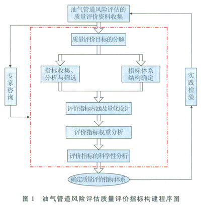 油氣管道風險評估質量評價指標體系的建立是一個反復的過程,涉及資料收集、評價目標分解、指標體系結構確定、指標的收集和篩選、指標內涵及量化性設計、指標權重分析、指標體系的篩選和分析、指標體系科學性分析(有效性分析、敏感性分析)等步驟。在評價指標體系的建立過程中,專家咨詢法將貫穿其中每一個環節,最后構建出的指標體系結構還應該在實踐中檢驗其有效性,才能在實際評價中應用。油氣管道風險評估的質量評價指標體系的建立程序如圖l所示。