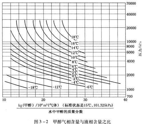 由于甲醇沸點低,故其蒸發(fā)量很大。甲醇在氣相中的蒸發(fā)損失可由圖3-2估計。該圖可外推至4.7MPa壓力以上,但在較高壓力下由圖3-2估計的氣相損失偏低。甘醇蒸發(fā)損失甚小,其量可以忽略不計。