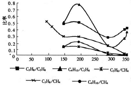 鏈烷比主要包括2類:一類是長鏈的烷烴氣體與甲烷的比值(C2H6/CH4,C3H8/ CH4,C4H10/ CH4),另一類是長鏈的烷烴氣體與乙烷的比值(C3H8/ C2H6,C4H10/ C2H6)。鏈烷比隨煤溫的變化曲線有類似于上述烯烷比的情況,如圖2所示。