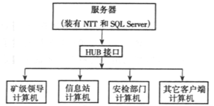 系統(tǒng)采用基于網(wǎng)絡(luò)的傳輸方式。從礦級(jí)領(lǐng)導(dǎo)、科室干部到管理人員都可通過(guò)網(wǎng)絡(luò)進(jìn)行信息傳輸。因此,利用本系統(tǒng)結(jié)合煤礦的網(wǎng)絡(luò)硬件資源條件,實(shí)現(xiàn)煤礦安全信息的錄入、查詢(xún)、修改、瀏覽和刪除等系統(tǒng)的硬件組成如圖2所示。