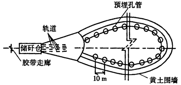 從儲藏煤矸石倉(20t)的膠帶中心線,用推土機推出寬10m、深1.5m的抗,用黃土堆積高度6m,兩側黃土壩為自然堆積(取出部分黃土用于注漿材料);其后繼續用推土機推出寬20m、深1.5m的坑,坑內堆積矸石高5.5m,矸石的輸送采取可移動伸縮性運輸膠帶,然后用推土機推平,直到矸石山邊界止。并盡可能把矸石兩 側黃土壩的黃土推入矸石層平面上振動碾壓(一般碾壓7遍),矸石山底部一層邊界斜坡30°,采取黃土覆蓋碾壓,矸石外側邊界為黃土圍墻。應盡可能多推出黃土來,以儲存上部幾層矸石層斜坡用黃土。新矸石山施工平面圖如圖1所示;施工剖面圖如圖2所示。