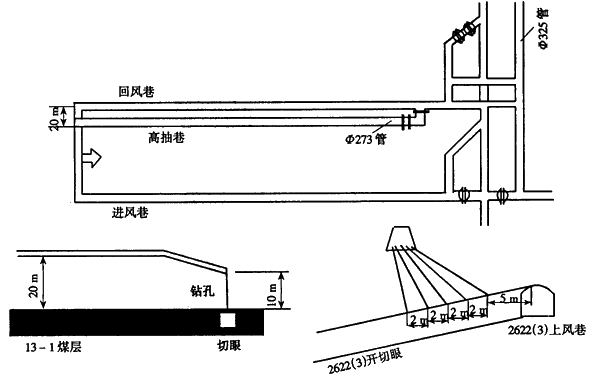 回采初期工作面瓦斯來源比較簡單,主要是開采層本身,這是瓦斯治理工作上有利的一面;在另一方面,采空區較短,頂板破壞程度較小,在垂直方向上受采動影響的范圍也不大,因此一些常用的采空區抽放方法如采空區埋管、頂板走向鉆孔、傳統的頂板高抽巷等都不起作用或效果不好。
