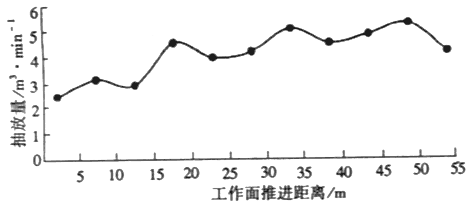 工作面開(kāi)始回采第2d尾抽巷即開(kāi)始抽放。在工作面回采初期的50m(老頂未冒落前),抽放流量一直保持在4~6 m3/min ,抽放率達(dá)50%以上,保證了工作面的安全生產(chǎn)。