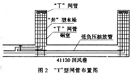 ????(3)采空區埋管瓦斯抽放。利用1臺2BEC50水環式真空泵對工作面采空區及上隅角的瓦斯進行抽放。41120工作面回采前,預先在工作面回風巷 預埋1趟Φ325mm瓦斯抽放管,根據頂板垮落步距及工作面初次來壓及周期來壓的規律,在抽放管上每隔30m安裝Φ325mm等徑三通并加閘閥,隨工作面的回采安設交替邁步“T”型網管,同時在上隅角構筑隔離墻(圖2)。