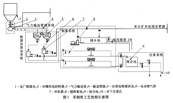????(1)主要生產工藝流程。電廠粉煤灰倉→雙嘴庫底卸料器→氣力輸送泵→輸送管路→注漿站粉煤灰倉→電動鎖氣器→沖灰器→攪拌漿池→混合池→注漿孔。