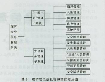 ??? (3)安全管理支持功能? 這是煤礦安全管理信息系統(MSMIS)與一般企業的管理信息系統最重要的區別,系統不僅應該實現對通風系統安全性的評價,還應該對瓦斯涌出情況、自燃火災發生情況等提前預測,根據對各類隱患、事故、“三違”人員等的統計分析,找出其中的規律,對可能經常出現隱患、發生事故的地點、種類提前報警,對最容易發生違章的人員作出歸類,對各級干部下井應該檢查的重點地區進行重點標注,方便企業決策者的日常管理。???
