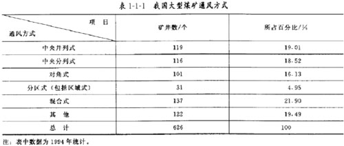 根據礦井的特點和需要,把中央式通風演變為中央一對角式混合通風系統。為適應綜采集約化生產,工作面單產超過1Mt/a的要求,對礦井采用分區域開拓。因此,形成區域式通風系統,即每個區域均有一組進、回風井,各個區域采用相對獨立的通風技術。它具有通風線路短、風阻小、區域間干擾小、安全性好,便于選擇主要通風機,使其實現高效節能的特點,提高了礦井的通風能力和抗災能力,適用于特大型礦井或因地質條件須把井田劃為若干獨立生產區域的礦井??傊?,新建大型礦井通風系統以對角式、分區式為主,改擴建的生產礦井以混合式為主,表1-1-1表示我國大型煤礦各類通風方式分布狀況。