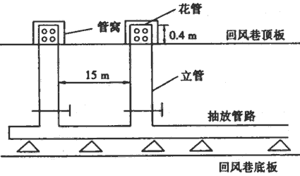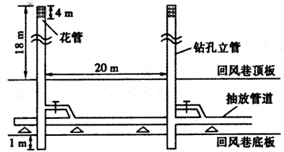 (4)立孔埋管抽放。為加大抽放力度,根據“兩帶”高度,用TUX-75鉆機在風巷沿垂直方向往頂底板打鉆孔,頂板孔18m(與冒落帶高度一致),底板孔1.0m(為便于固定立管),孔徑為127mm。在鉆孔內埋直徑為108mm的套管,套管上到孔頂,下到孔底,頂部4.0m打花眼,底孔埋管后注漿固管。當工作面推地預埋的立管后,頂板冒落,立管的花管部分處在冒落的頂板與裂隙帶之間的空間內。在立管的下部用三通與抽放管路連接,立孔間距20m。如圖6所示。