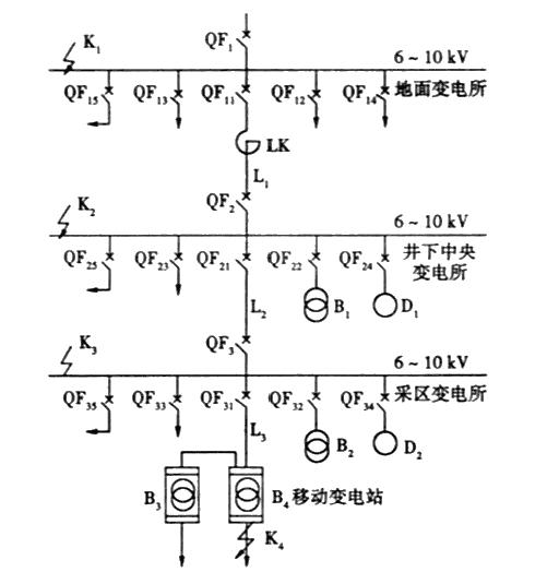????典型的井下高壓供電系統(tǒng)是一個單側(cè)電源三級線路供電系統(tǒng),如圖1所示。