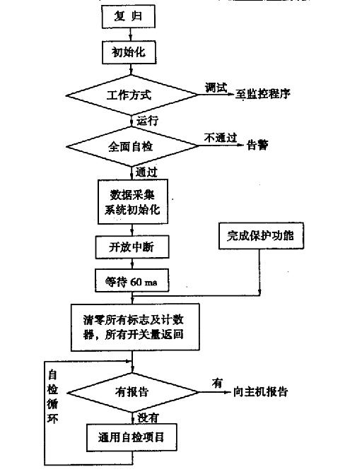 ????系統軟件包括分機軟件與主機軟件兩部分,其中分機軟件由分機主程序、采樣中斷服務程序、故障處理程序三部分組成。主程序主要包括初始化和自檢循環兩部分內容。分機主程序流程圖如圖5。