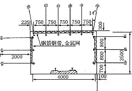 在代帽柱的掩護下,在茬巖上部打托鉤眼安設托鉤。緊固螺帽用單螺帽將吊環固定在錨桿上。前探梁穿入吊環中,端頭搭在托鉤之上,并用楔將前探梁與吊環背緊,前探梁上用木背板構頂背牢。
