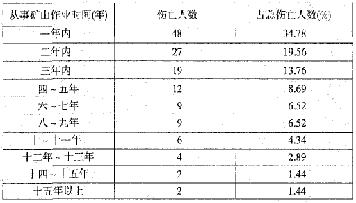 ????從表二可分析出:從事礦山作業一年內(或剛入礦山人員傷亡人數為48人,占34.78%,死亡率較高,其次是二年內礦齡內的作業人員,隨著礦齡的增加,其死亡率在下降。究其原因,主要是新人礦山人員對適應礦山采掘工作面作業環境、操作技能、自保安全常識較差。