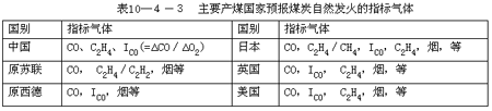 能反映煤炭自熱或可燃物燃燒初期階段特征的、并可用來作為火災早期預報的氣體叫指標氣體。指標氣體必須具備如下條件:①靈敏性,即正常大氣中不含有,或雖含有但數量很少且比較穩定,一旦發生煤炭自熱或可燃物燃燒,則該種氣體濃度就會發生較明顯的變化。②規律性,即生成量或變化趨勢與自熱溫度之間呈現一定的規律和對應關系。③可測性,可利用現有的儀器進行檢測。目前,如表10—4-3所示。