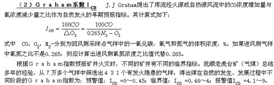 (1)一氧化碳(CO),一氧化碳生成溫度低,生成量大,其生成量隨溫度升高按指數規律增加,是預報煤炭自燃火災的較靈敏的指標之一。在正常時若大氣中含有CO,則采用CO作為指標氣體時,要確定預報的臨界值。確定臨界值時一般要考慮下列因素:①各采樣地點在正常時風流中CO的本底濃度;②臨界值時所對應的煤溫適當,即留有充分的時間尋找和處理自熱源。