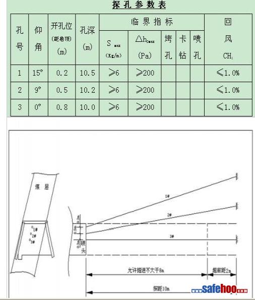 3、采煤前進(jìn)行突出危險(xiǎn)性預(yù)測(cè)時(shí),其鉆孔的孔距、深度、排放瓦斯時(shí)間等根據(jù)現(xiàn)場(chǎng)的具體情況來(lái)確定。