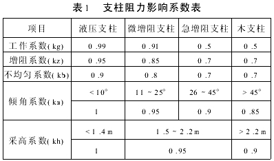 ??? ①支護設計中,支柱實際支撐能力與支柱在采場實際工作狀況、增阻過程、支撐不均勻狀況和采煤工作面的傾角、采高等因素有關,其計算為: