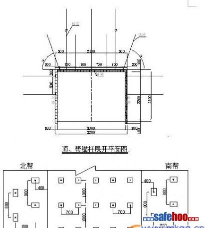 1、巷永久支護為矩形斷面,錨桿、鋼筋網(wǎng)、混凝土聯(lián)合支護,巷道設計掘進寬度為3200mm,巷道掘進高度為2300mm,巷道設計凈寬度為3000mm,巷道凈高度為2200mm。 混凝土噴射厚度為100 mm,混凝土標號不低于C15。