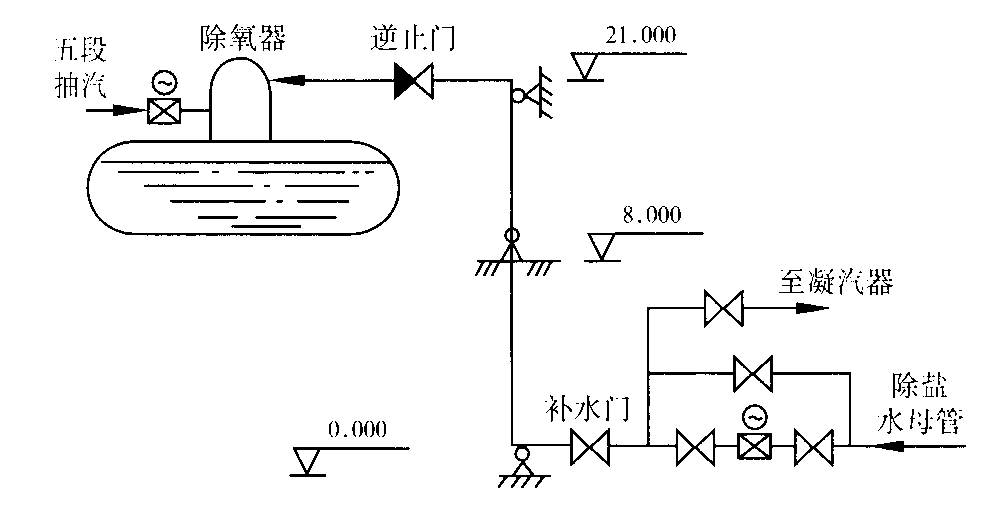 振動情況是,開始補水時振動幾下,補水中不振,補完后振動30~45 min,表現(xiàn)為劇烈的、如放炮似的連續(xù)間隔振動,整個管道從21 m除氧頭一直至0 m補水門處都在振顫,非常可怕,補水管道發(fā)生過多次不安全情況。在原因分析不準確情況下,將補水逆止門3次改變位置,改變與除氧頭的距離,提高逆止門壓力等級,但未取得任何效果。