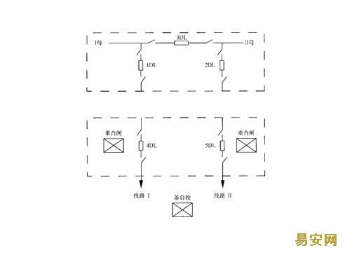 正常情況下,Ⅰ母、Ⅱ母分列運行,分別由線路Ⅰ和Ⅱ供電。當線路Ⅰ(Ⅱ)發生故障時,對側4DL(5DL)跳開。若為瞬時故障,4DL(5DL)處重合閘裝置動作,成功恢復正常供電;若為永久性故障,則4DL(5DL)處重合閘失敗,本側備自投裝置立即動作,跳開1DL(2DL),合上3DL,恢復正常供電。