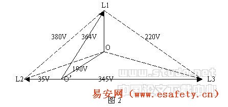 因此,如果150W燈泡的電阻為R,則15W燈泡的電阻為10R,這樣380V電壓就按1與10的比例分配在兩個燈泡上。150W燈泡上的電壓僅為35V,而15W的燈泡上電壓則高達345V,它不久即被燒壞。為進一步分析清楚,可作圖1的電壓相量圖,如圖2所示。從圖可知三相回路相間電壓仍為380V不變,負載側的中心點由O點轉移到O’點,中性線對地電壓達190V(在TN系統中,它可引起電擊事故),而空載的L1相電壓則高達364V,三相電壓極不平衡。