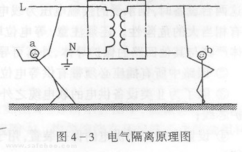 電氣隔離實質上是將接地的電網轉換為一范圍很小的示接地電網。圖4-3是電氣隔離的原理圖。分析圖中a,b兩人的觸電危險性可以看出:正常情況下,由于N線(或PEN線)直接接地,使流經a的電流沿系統的工作接地和重復接地構成回路,a的危險性很大;而流經b的電流只能沿絕緣電阻和分布電容構成回路,電擊的危險性可以得到抑制。