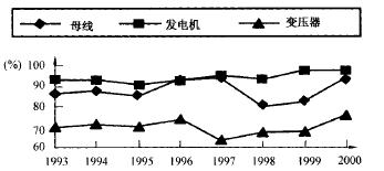 2000年100MW及以上發(fā)電機(jī)保護(hù)正確動作率為97.09%,220KV及以上系統(tǒng)變壓器保護(hù)正確動作率為75.24%。220KV及以上系統(tǒng)母線保護(hù)正確動作率93.59%。1993年到2000年上述保護(hù)正確動作率情況見圖6-2-2。母線保護(hù)正確動作率有了一定幅度提高,但近年來波動較大,鑒于母線保護(hù)的重要性,其正確動作率的提高對電網(wǎng)安全穩(wěn)定運(yùn)行水平的提高有重要作用,有待于進(jìn)一步提高。
