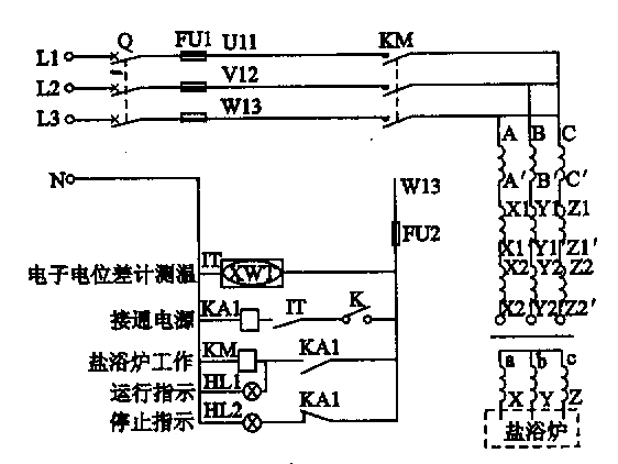 筆者曾在某廠熱處理車間工作多年,其車間有兩臺(tái)用于淬火的鹽浴爐。鹽浴爐要求在低電壓、大電流下工作,因此必須用變壓器來改變電壓電流。根據(jù)生產(chǎn)工藝要求,該變壓器有三個(gè)檔位,分別對(duì)應(yīng)鹽浴的三種工作狀態(tài):1檔用于爐子升溫;2檔用于爐子保溫;3檔用于工件淬火。而1檔、2檔、3檔的定位是通過一只機(jī)械式分接開關(guān)去改變鹽浴爐變壓器的原邊繞組接線端來實(shí)現(xiàn)的,并且換檔操作由操作工人來完成。其主電路和控制電路如圖1所示,其中1T是電子電位差計(jì),用于爐溫的設(shè)定與控制。