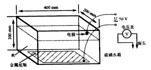 ???? 實驗方法:用一玻璃水箱注入自來水,底部鋪設一金屬板(模擬大地)作為一極,在水箱一側壁水下固定一小塊銅片(模擬漏電點)作為另一極(見圖3),分別將兩極用導線引出,加入50V變流電;用兩只金屬探頭及電壓表,測試水中三維空間任意兩點間的電壓及電位差。