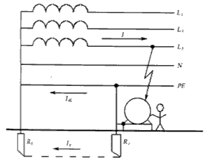 ???? 圖4為典型有重復接地的保護接零系統,在從設備發生碰殼短路時起,到線路保護裝置動作完成后的短時間內,設備外殼所帶電壓UJC為短路電流I dL在保護零線PE上產生的電壓降;經重復接地電阻RC工作接地電阻RO分壓后產生。簡化電路如圖5所示。