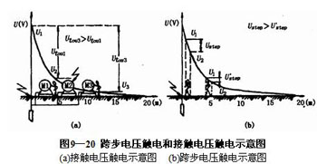 電氣設備發生接地故障時,在接地電流入地點周圍電位分布區(以電流入地點為圓心,半徑為20m的范圍內)行走的人,其兩腳將處于不同的電位,兩腳之間(一般人的跨步約為0.8m)的電位差稱之為跨步電壓。設前腳的電位為U1,后腳的電位為U2,則跨步電壓Ustep=U1—U2,顯然人體距電流入地點越近,其所承受的跨步電壓越高,見圖9—20(b)所示。