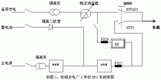 撫順發電廠2號機為2002年6月投產的200MW采暖、凝汽兩用式汽輪發電機組。其單元220V不間斷電源系統選用由美國GUTOR公司生產,青島整流器廠經銷的PEW1000型UPS系統;該系統只供重要的調節、控制、保護儀表監測和重要信號電源,不做一般負荷電源。