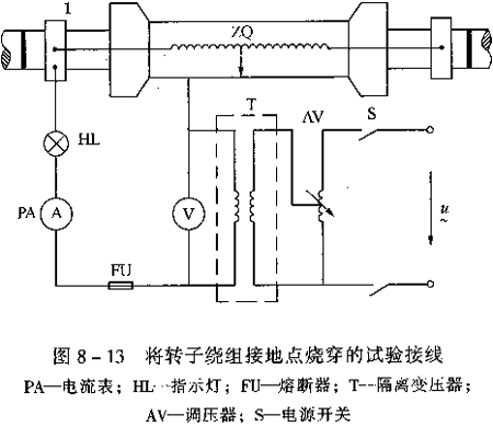 如需將轉(zhuǎn)子繞組較高的接地電阻通過燒穿試驗(yàn)變成較低的穩(wěn)定接地電阻,可按圖8—13所示試驗(yàn)接線進(jìn)行。圖中:電流表PA用作監(jiān)視燒穿接地點(diǎn)電流;燈泡HL用作限流和在燒穿時(shí)發(fā)亮信號(hào);熔斷器FU用作保護(hù),以免電流持續(xù)時(shí)間過長(zhǎng),燒壞轉(zhuǎn)子部件。