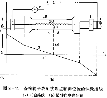 在轉子本體兩端(2和2')間,通人較大的電流(例如50MW發電機的轉子需通人500-1000A),若以接地點k為參考點,沿轉子長度的電位分布,而與轉子軸絕緣的滑環(1、1')和轉子繞組ZQ,其電位與接地點k電位相同,均為零。因此,測量時,只需將檢流計P的一端接滑環(1或1'),另一端接探針5,并將探針沿轉子本體軸向移動,監視檢流計的指示,當檢流計指示為零或接近于零時,該處即為轉子繞組接地點k所在轉子斷面的軸向位置。測量時,所加電流越大,靈敏度越高。