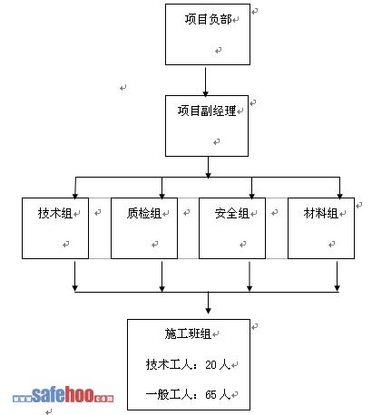 為確保優質、高速、安全、文明地完成本工程建設任務,項目經理部本著科學管理、精干高效、結構合理的原則,選配具有改革開拓精神、施工經驗豐富、服務態度良好、勤奮實干的工程技術和管理人員。項目經理部設項目經理一名、技術負責人一名、項目主管生產副經理一名組成項目領導層。下設"四部一室",即施工部、技術部、質安部、物資部、辦公室,組成項目管理層