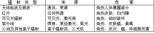 所有種類的電磁波的共同點是:它們都以光速傳播,可見光本身也是一種輻射,其組成的波長在光譜中介于紅外光及紫外光之間。從本質上來講,有兩種形式的輻射,即離子型及非離子型,它們還可以進一步劃分。下表給出了幾種輻射形式產生的原因以及對人的危害。?