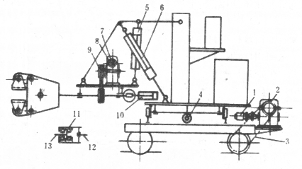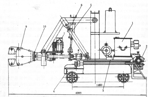 1―油箱(包括油馬達) 2、7―蝸輪蝸桿減速器 3―小車(底盤) 4―大車(底盤) 5―支承缸 6―調平缸 8―夾緊缸 9―夾鉗 10―鉗桿