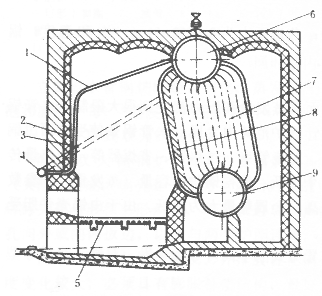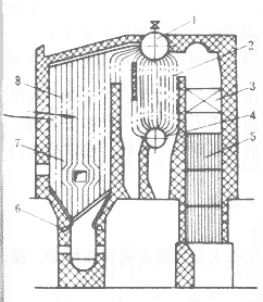 1―上鍋筒 2―對流管束 3―省煤器 4―下鍋筒 5―空氣預熱器 6―聯箱 7―爐膛 8―水冷壁