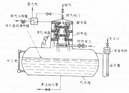 (2) 為保證除氧器的剩余壓力和水位穩定,應裝置壓力自動調節器和水位自動調節器,還要裝置溫度自動記錄表和除氧水取樣管等。